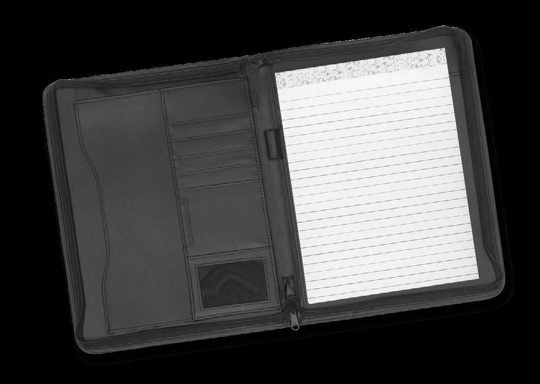 Large PU portfolio with a secure zippered closure, a large internal document folder, a lined A4 pad, several pockets for business cards and a pen loop. It laser engraves to a matt brown finish.