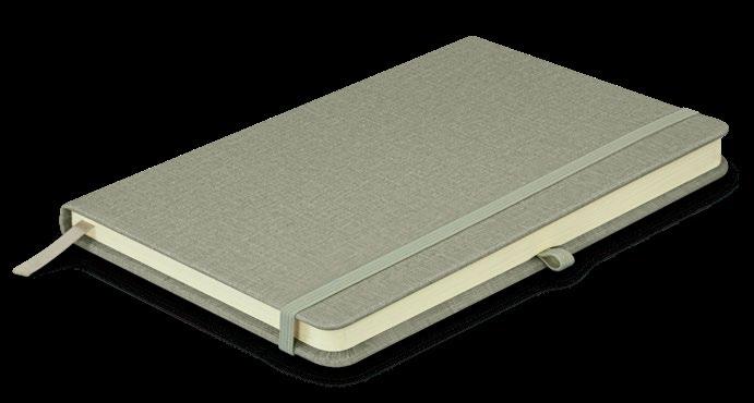 Sleek medium-size notebook with 80 leaves (160 pages) of 80gsm lined cream paper. It has a hard cover with a woven PU finish. Other features include an elastic closure band, a bookmark ribbon and a pen loop.