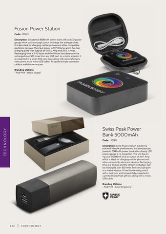 Swiss Peak Power Bank 5000mAh Code: 110009 Description: Swiss Peak excels in designing practical lifestyle products and this compact yet powerful 5000mAh power bank with a handy LED power gauge is no exception. The unit has an input of 5V/800mA and an output of 5V/1 Amp which is ideal for charging mobile phones and other compatible electronic devices. Recharging time is 5-6 hours and the lithium ion battery can be recharged over 500 times from any USB port or a mains adaptor. It has its own carry pouch with a belt loop and is beautifully presented in a printed Swiss Peak gift box along with a micro USB cable. Branding Options: • Pad Print • Laser Engraving