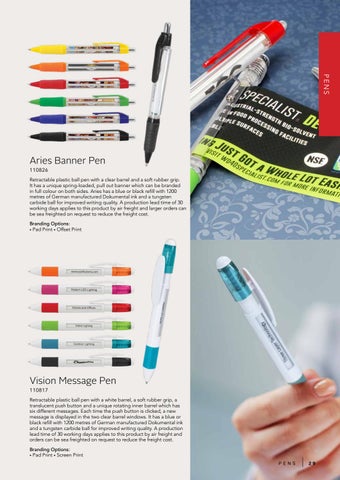 Retractable plastic ball pen with a clear barrel and a soft rubber grip. It has a unique spring-loaded, pull out banner which can be branded in full colour on both sides. Aries has a blue or black refill with 1200 metres of German manufactured Dokumental ink and a tungsten carbide ball for improved writing quality. A production lead time of 30 working days applies to this product by air freight and larger orders can be sea freighted on request to reduce the freight cost. Branding Options: • Pad Print • Offset Print