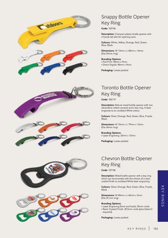 Toronto Bottle Opener Key Ring Code: 106174 Description: Robust metal bottle opener with two decorative rubber accents and a key ring. It laser engraves to an oxidised White colour. Colours: Silver, Orange, Red, Green, Blue, Purple, Black. Dimensions: W 15mm x L 79mm x 12mm (Dia 24mm ring). Branding Options: • Laser Engraving: 32mm x 12mm. Packaging: Loose packed.