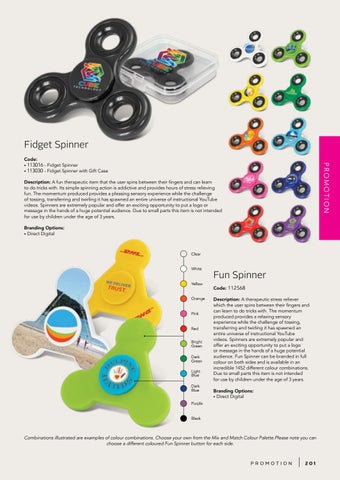 Fun Spinner Code: 112568 Description: A therapeutic stress reliever which the user spins between their fingers and can learn to do tricks with. The momentum produced provides a relaxing sensory experience while the challenge of tossing, transferring and twirling it has spawned an entire universe of instructional YouTube videos. Spinners are extremely popular and offer an exciting opportunity to put a logo or message in the hands of a huge potential audience. Fun Spinner can be branded in full colour on both sides and is available in an incredible 1452 different colour combinations. Due to small parts this item is not intended for use by children under the age of 3 years. Branding Options: • Direct Digital