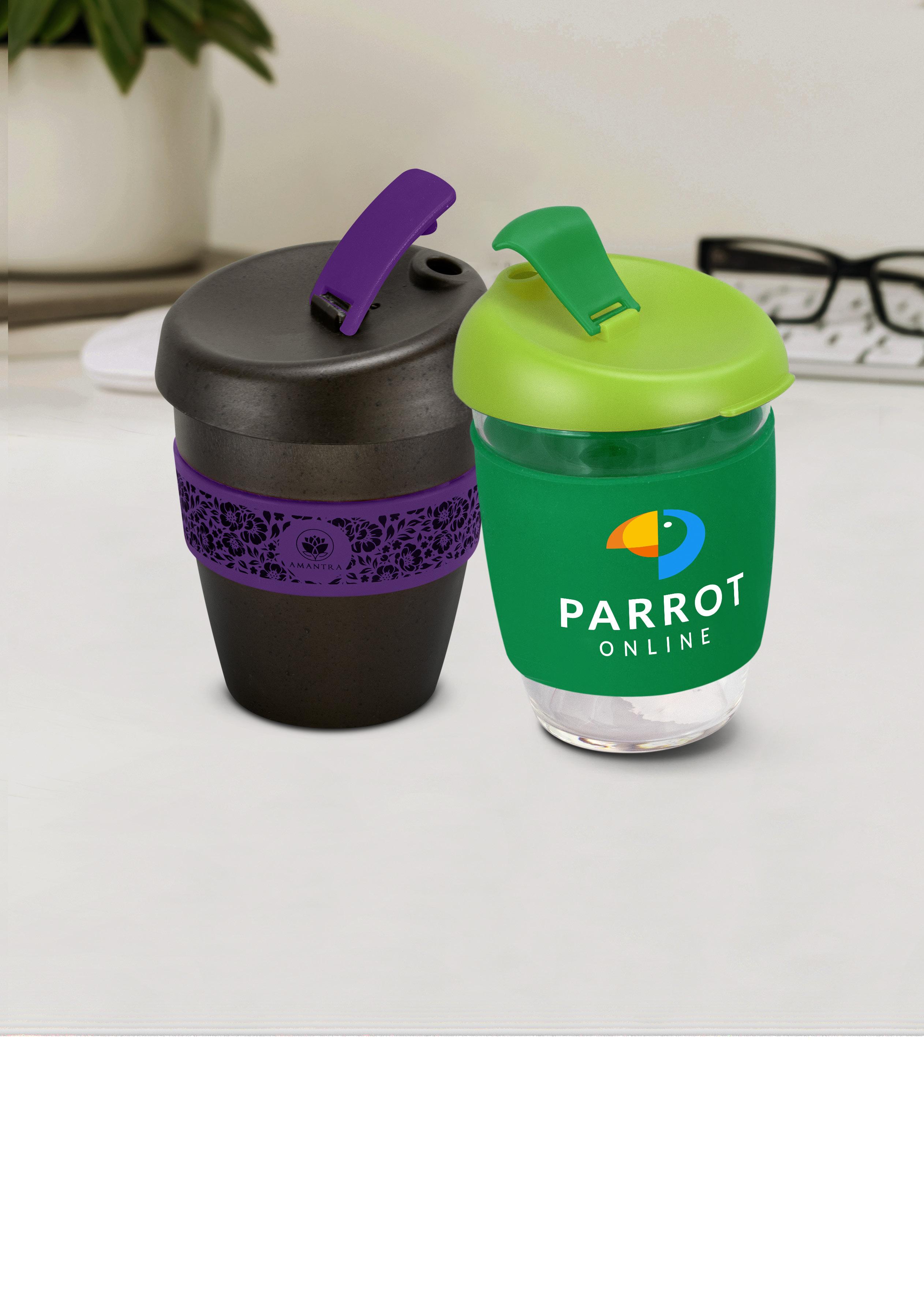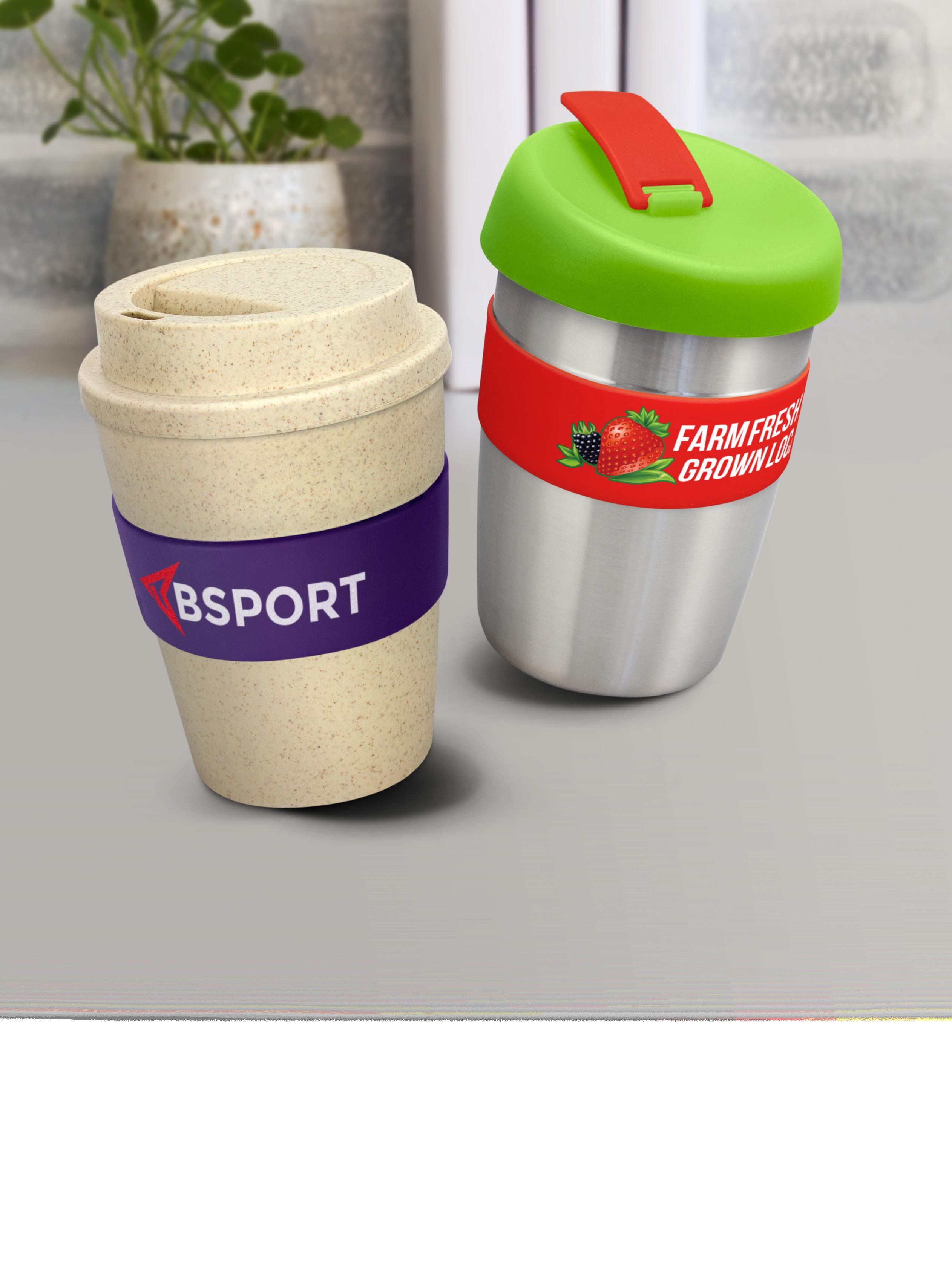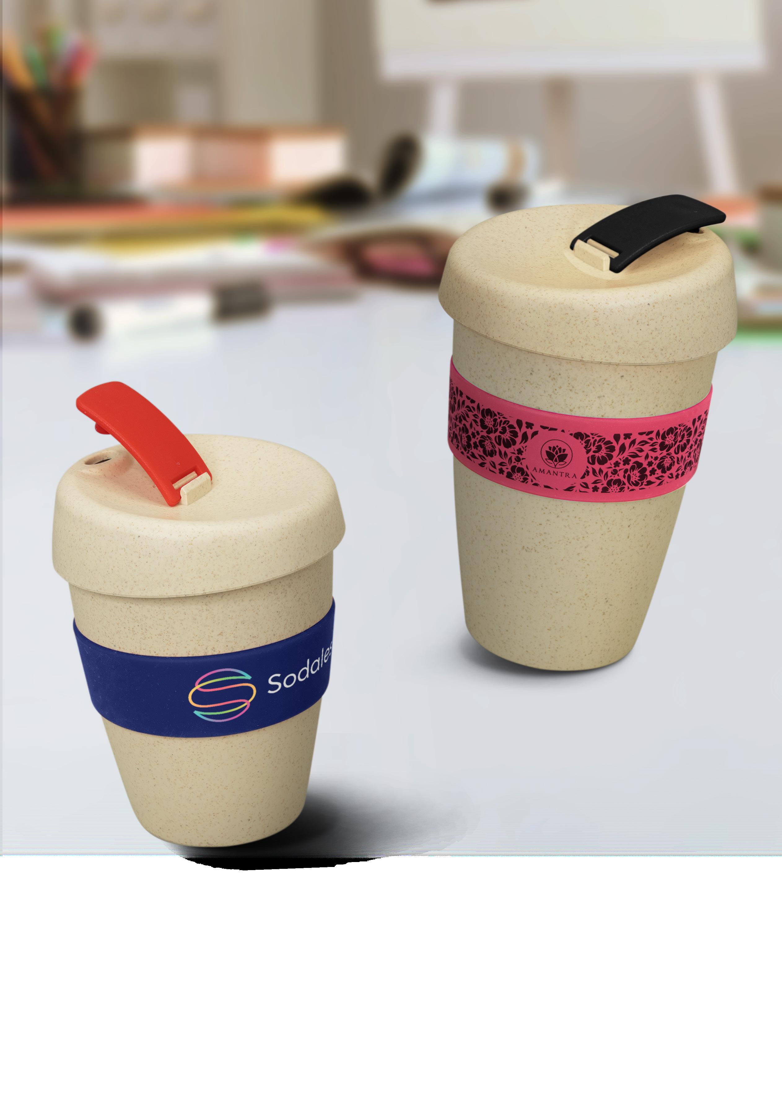 • Reusable coffee cup made from BPA-free polypropylene and natural rice husk fibre