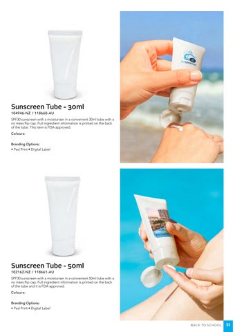 SPF30 sunscreen with a moisturiser in a convenient 50ml tube with a no mess flip cap. Full ingredient information is printed on the back of the tube and it is FDA approved. Colours: Branding Options: • Pad Print • Digital Label
