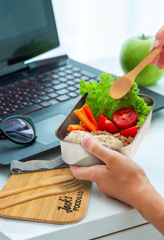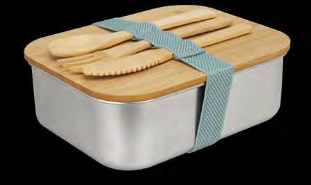 120046 Stylish and functional stainless steel lunchbox with a natural bamboo lid. This generous lunchbox includes an elastic woven strap to secure the lid, which conveniently holds a bamboo knife, fork, and spoon. Bamboo is a natural material which produces unavoidable variances in the grain pattern, colour and branding. This product is not dishwasher safe and handwashing is recommended.