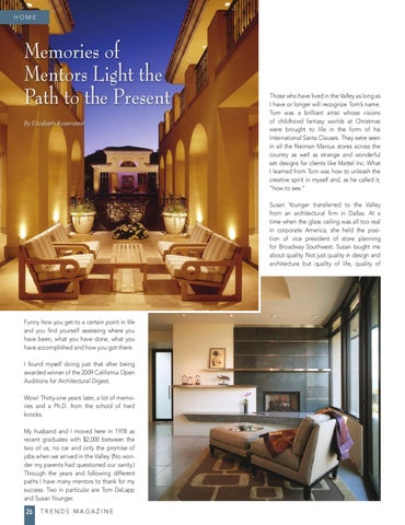 Those who have lived in the Valley as long as I have or longer will recognize Tom’s name. Tom was a brilliant artist whose visions of childhood fantasy worlds at Christmas were brought to life in the form of his International Santa Clauses. They were seen in all the Neiman Marcus stores across the country as well as strange and wonderful set designs for clients like Mattel Inc. What I learned from Tom was how to unleash the creative spirit in myself and, as he called it, “how to see.” Susan Younger transferred to the Valley from an architectural firm in Dallas. At a time when the glass ceiling was all too real in corporate America, she held the position of vice president of store planning for Broadway Southwest. Susan taught me about quality. Not just quality in design and architecture but quality of life, quality of