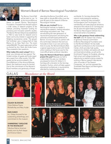 Women’s Board of Barrow Neurological Foundation The Barrow Grand Ball will be held on Jan. 16 at the Arizona Biltmore Resort to benefit Barrow Neurological Foundation. Proceeds from the ball support a wide variety of research projects at the institute, providing important funding for promising and innovative scientific studies. The Barrow Women’s Board was established in 1965 to raise funds for research and to foster community interest in supporting the fledgling neuroscience center. The group’s first fundraiser was a masque ball at Casa Blanca Inn on New Year’s Eve. The event netted $26,000. This year’s gala event will be co-chaired by Ann Denk and Ardie Evans. They answered a few questions.. What makes this event unique? We’re small, very intimate and very special. The limited number of guests and funds raised set us apart from other events. Only 350 guests can be accommodated in the Grand Ballroom of the Arizona Biltmore Resort, the traditional venue for the ball. Due to the commitment of the Women’s Board members and generosity of those