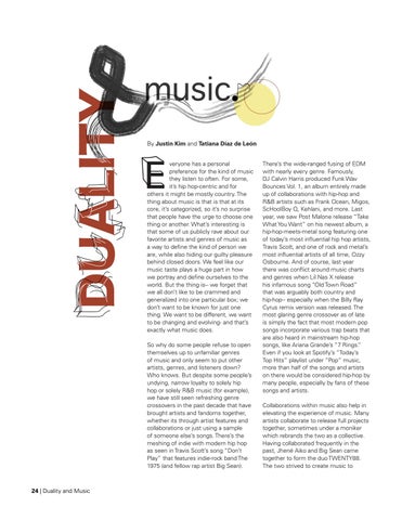 veryone has a personal preference for the kind of music they listen to often. For some, it’s hip hop-centric and for others it might be mostly country. The thing about music is that is that at its core, it’s categorized, so it’s no surprise that people have the urge to choose one thing or another. What’s interesting is that some of us publicly rave about our favorite artists and genres of music as a way to define the kind of person we are, while also hiding our guilty pleasure behind closed doors. We feel like our music taste plays a huge part in how we portray and define ourselves to the world. But the thing is-- we forget that we all don’t like to be crammed and generalized into one particular box; we don’t want to be known for just one thing. We want to be different, we want to be changing and evolving- and that’s exactly what music does. So why do some people refuse to open themselves up to unfamiliar genres of music and only seem to put other artists, genres, and listeners down? Who knows. But despite some people’s undying, narrow loyalty to solely hip hop or solely R&B music (for example), we have still seen refreshing genre crossovers in the past decade that have brought artists and fandoms together, whether its through artist features and collaborations or just using a sample of someone else’s songs. There’s the meshing of indie with modern hip hop as seen in Travis Scott’s song “Don’t Play” that features indie-rock band The 1975 (and fellow rap artist Big Sean).