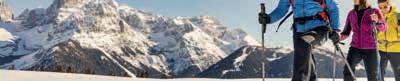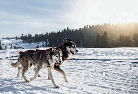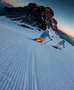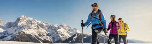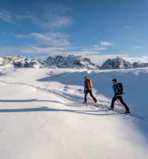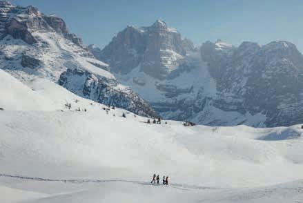 Ovviamente per vivere il mondo della neve le opportunità includono anche la tranquilla escursione a piedi sulla neve o, aggiungendo un pizzico di avventura, con le racchette da neve ai piedi lungo gli itinerari in uno dei Parchi naturali trentini. Si procede senza fretta, per lasciare spazio allo stupore, ammirando gli spettacoli più insoliti della natura, avvolti dal silenzio, respirando l’aria pura, spingendosi no ad una malga o ad un rifugio, nell’orizzonte delle cime innevate. Lo scialpinismo, in ne, trasferisce e ampli ca queste emozioni nell’ambiente dell’alta montagna; qui le sensazioni e le emozioni di stare nella natura più severa ma anche più attraente, si fondono all’incontenibile ebbrezza di una discesa nella neve polverosa. Ancor più estremo ed in libertà, in Trentino si possono trovare alcuni tra gli spot più interessanti per provare anche l’esperienza del freeride, per lasciare la propria traccia sui pendii in fuoripista, avvolti dal silenzio, ma sempre in modo responsabile e consapevole.