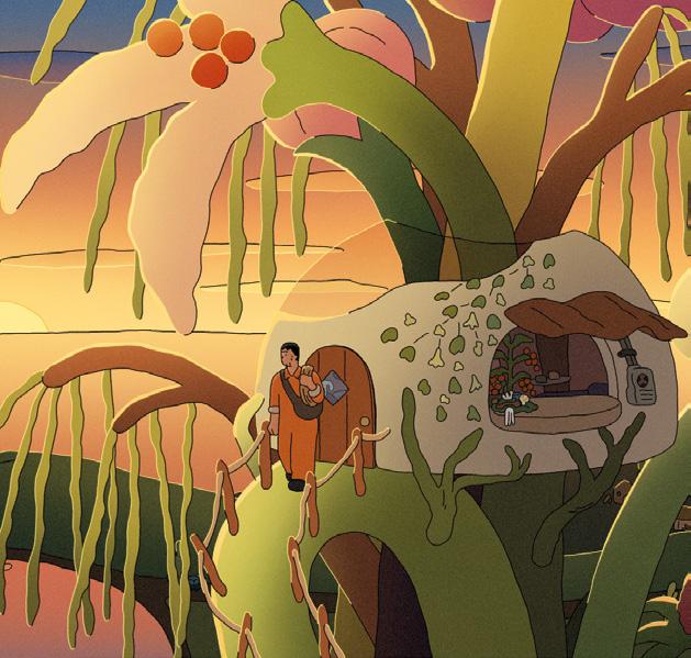L’architetto raccoglie dei pomodorini maturi da un piccolo orto vicino alla finestra per prepararsi il pranzo da portare al lavoro. Dalle piante di pomodoro si sprigiona una speciale eco-energia. Questa energia, frutto di piccoli gesti di tutela ambientale, accompagna l’architetto nella lotta contro la crisi climatica.