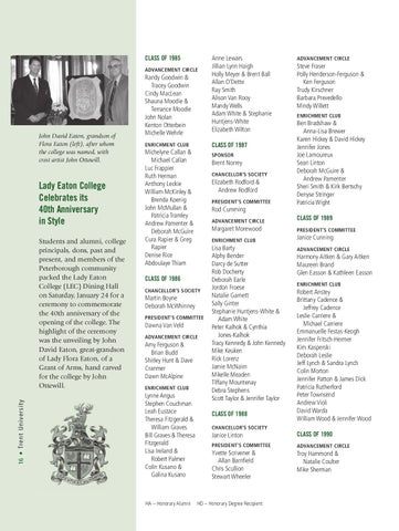 Lisa Barty Alphy Bender Darcy de Sutter Rob Docherty Deborah Earle Jordon Froese Natalie Garnett Sally Ginter Stephanie Huntjens-White & Adam White Peter Kalhok & Cynthia Jones-Kalhok Tracy Kennedy & John Kennedy Mike Keuken Rick Lorenz Jamie McNairn Mikelle Meaden Tiffany Mountenay Debra Stephens Scott Taylor & Jennifer Taylor CLASS OF 1988 CHANCELLOR’S SOCIETY