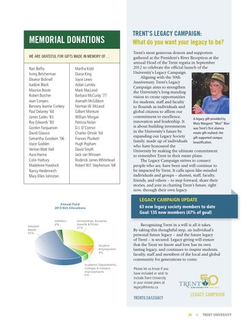 Trent’s most generous donors and supporters gathered at the President’s River Reception at the annual Head of the Trent regatta in September 2012 to celebrate the official launch of the University’s Legacy Campaign. Aligning with the 50th Anniversary, Trent’s Legacy Campaign aims to strengthen the University’s long-standing vision to create opportunities for students, staff and faculty to flourish as individuals and global citizens to affirm our commitment to excellence, A legacy gift provided by innovation and leadership. It Mary Margaret “Mori” Blue is about building investments was Trent’s first alumna in the University’s future by estate gift realized. Her expanding our Legacy Society gift supported campus family, made up of individuals beautification. who have honoured the University by making the ultimate commitment to remember Trent in their estate plans. The Legacy Campaign strives to connect people who are, have been and will continue to be impacted by Trent. It calls upon like-minded individuals and groups – alumni, staff, faculty, friends, and others – to step forward, share their stories, and join in charting Trent’s future, right now, through their own legacy.