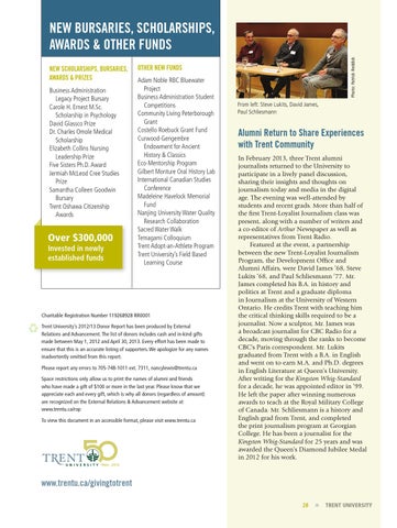 Alumni Return to Share Experiences with Trent Community In February 2013, three Trent alumni journalists returned to the University to participate in a lively panel discussion, sharing their insights and thoughts on journalism today and media in the digital age. The evening was well-attended by students and recent grads. More than half of the first Trent-Loyalist Journalism class was present, along with a number of writers and a co-editor of Arthur Newspaper as well as representatives from Trent Radio. Featured at the event, a partnership between the new Trent-Loyalist Journalism Program, the Development Office and Alumni Affairs, were David James ’68, Steve Lukits ’68, and Paul Schliesmann ’77. Mr. James completed his B.A. in history and politics at Trent and a graduate diploma in Journalism at the University of Western Ontario. He credits Trent with teaching him the critical thinking skills required to be a journalist. Now a sculptor, Mr. James was a broadcast journalist for CBC Radio for a decade, moving through the ranks to become CBC’s Paris correspondent. Mr. Lukits graduated from Trent with a B.A. in English and went on to earn M.A. and Ph.D. degrees in English Literature at Queen’s University. After writing for the Kingston Whig-Standard for a decade, he was appointed editor in ’99. He left the paper after winning numerous awards to teach at the Royal Military College of Canada. Mr. Schliesmann is a history and English grad from Trent, and completed the print journalism program at Georgian College. He has been a journalist for the Kingston Whig-Standard for 25 years and was awarded the Queen’s Diamond Jubilee Medal in 2012 for his work.