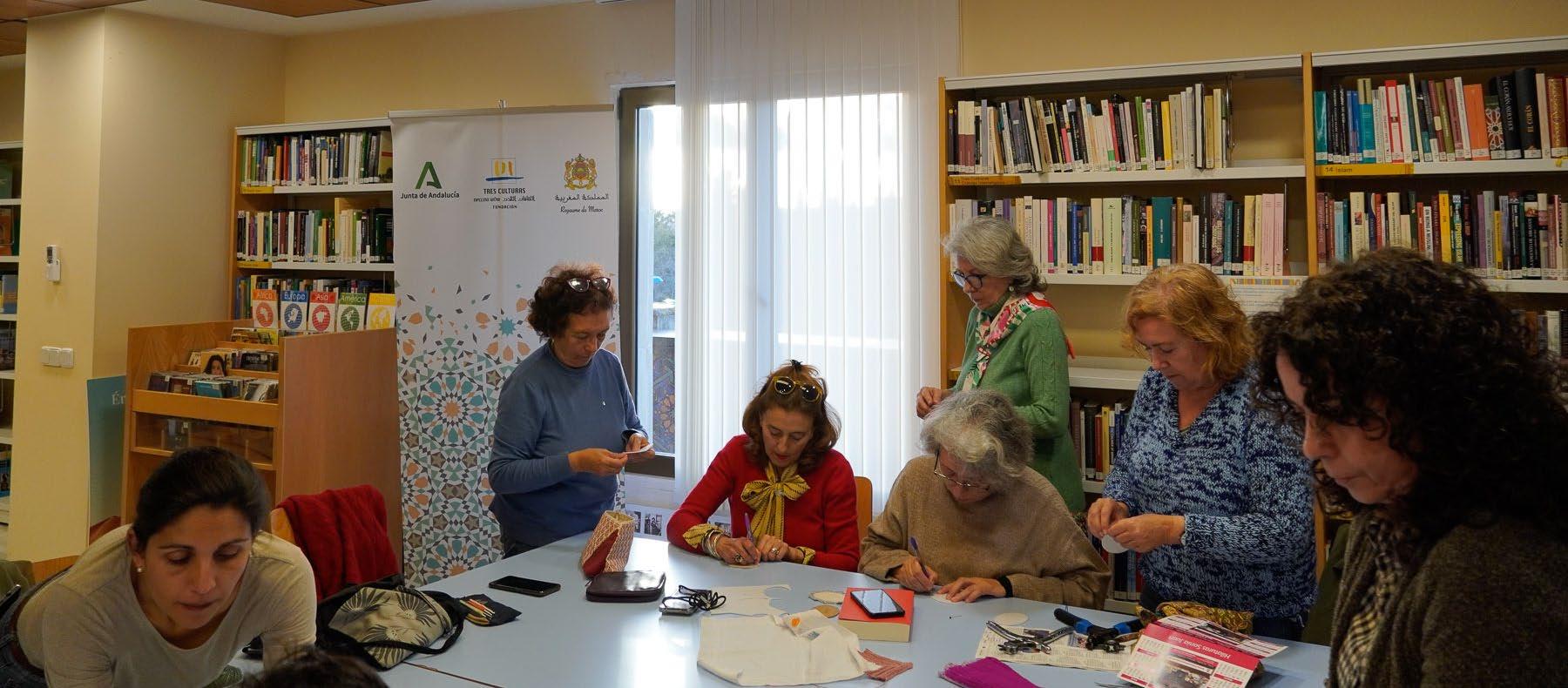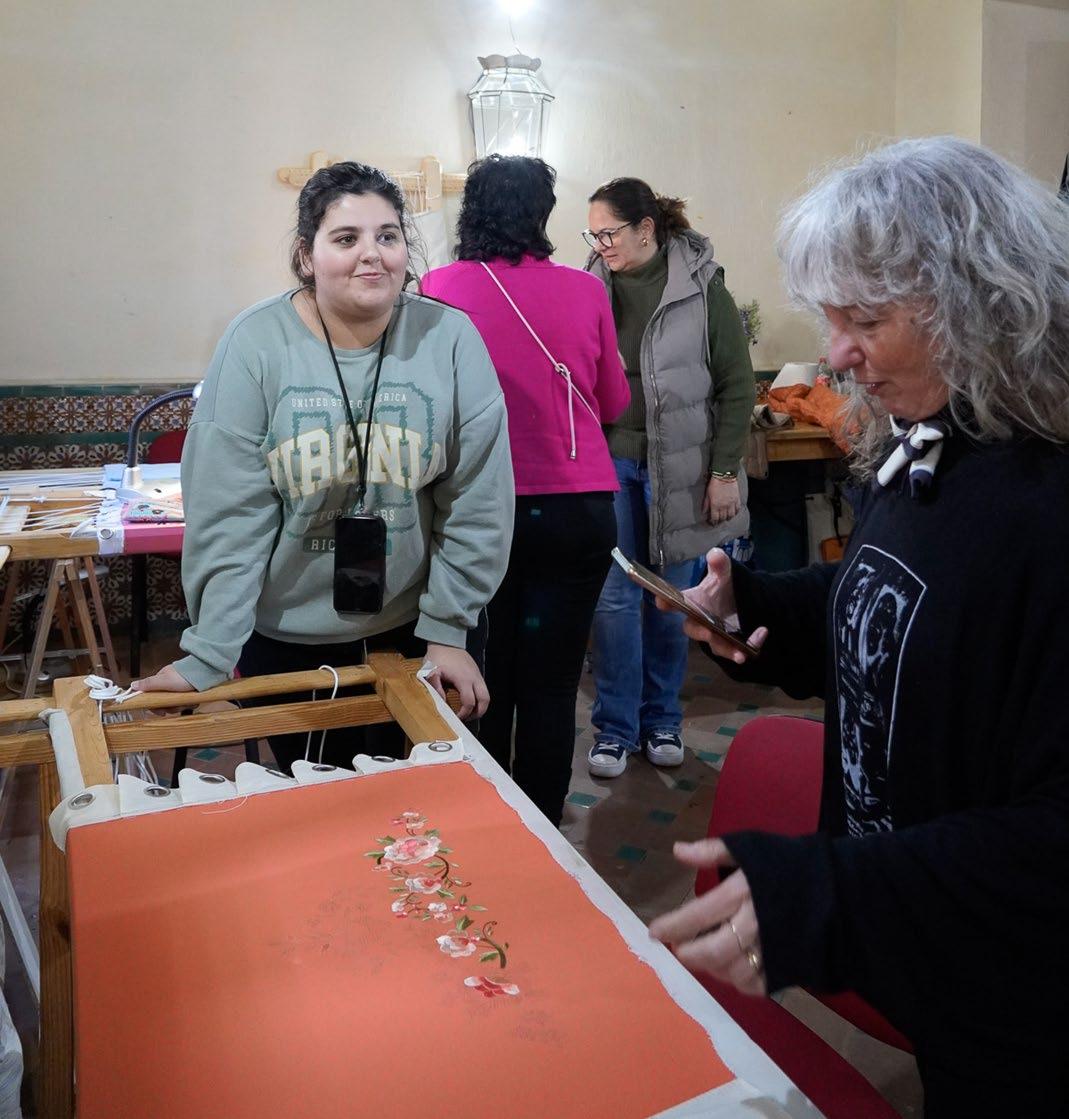 Nouhaila Mezrhab asistió de lunes a jueves durante su estancia en Sevilla al taller de bordado en seda y flecado de mantones guiado por la Asociación de Mujeres sin ánimo de lucro Entre Mantones y Sedas de Espartinas, Sevilla.