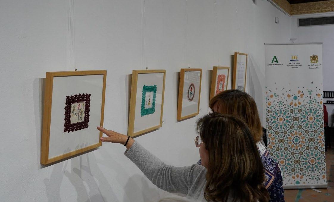 Durante la inauguración de la exposición, se pudo visitar el taller donde habitualmente trabajan de lunes a jueves las bordadoras de la Asociación de Mujeres ‘Entre Mantones y Sedas’. En la foto Nouhaila muestra su trabajo de bordado en seda a Esperanza R. Labrador, del colectivo Tejedoras del Muelle de la Sal.