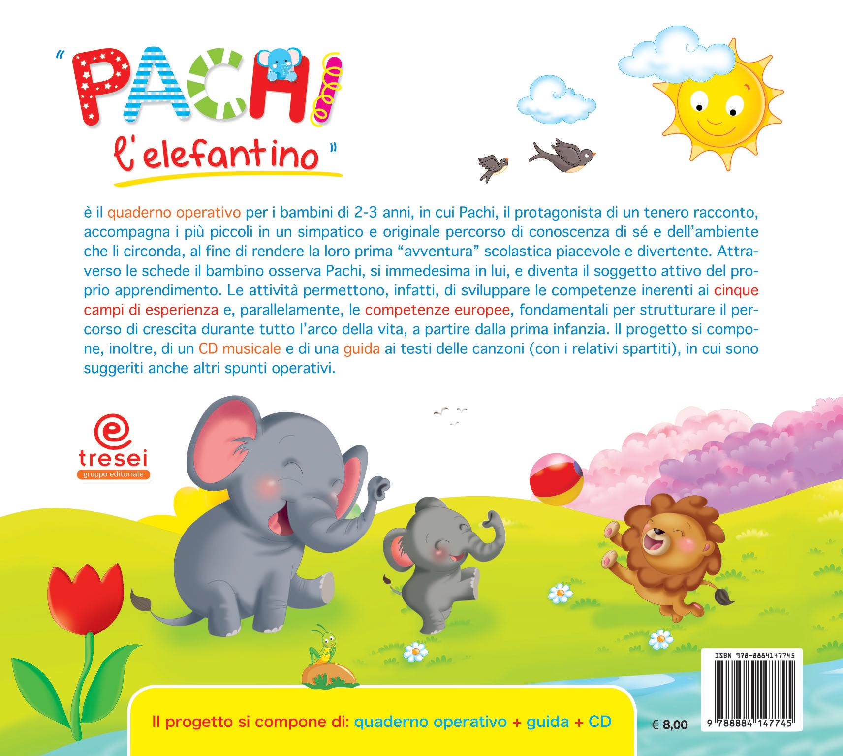 “Io non ti voglio lasciare!” urlò Pachi. Fu proprio un urlo tremendo... da elefante, tanto che gli altri animali smisero di giocare. La mamma lo abbracciò e gli disse: “Facciamo un patto: tu giochi un pochino con la tua maestra e gli altri ani maletti, io ti aspetterò fuori, ti guarderò da lontano, poi, fra pochissimo, tornerò a prenderti”. L’elefantino cominciò a piangere, ma la mamma lo baciò e si allontanò un po’. Pachi infatti poteva vederla. La maestra lo prese con sé e gli parlò dolcemente per rassicurarlo; proprio in quel momento, il leoncino gridò: “Maestra, giochiamo a palla?”. L’insegnante diede la palla a Pachi per fare il primo tiro, l’elefantino, usando la sua proboscide, fece un lungo lancio, il leoncino la prese e la rilanciò gridando: “Dai elefantino, ritira la palla, sei forte!”. Pachi iniziò a giocare e si divertì un mondo, capì che i suoi nuovi compagni avevano bisogno di lui per giocare e che la maestra gli voleva bene e si sarebbe occupata di lui come faceva con gli altri piccoli. Per un po’ non ebbe nostalgia della mamma. Quando quest’ultima arrivò, Pachi era così felice che chiese subito: “Mamma, domani posso ritornare a scuola?”e incominciò a raccontare di quanto era stato bravo a giocare a palla e di come erano divertenti i suoi compagni. La mamma lo ascoltava e anche lei era felice.