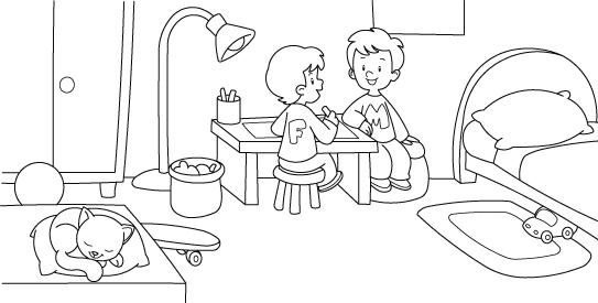 Il gatto dorme il cuscino. La palla si trova all’armadio. La macchinina è al letto. I pennarelli sono al portapenne. La lampada è di Federico. L’armadio è di Mattia. Il cestino si trova alla scrivania. Il tappeto sta dall’armadio.