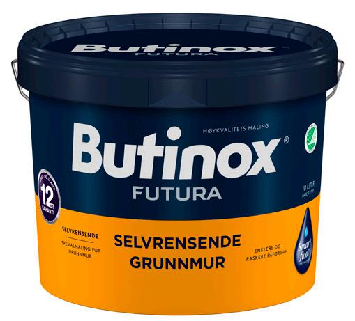 Grunnmuren males med nyheten Butinox Futura Selvrensende Grunnmur. Den selvrensende spesialmalingen gir langvarig nymalt og rent utseende, samt effektiv beskyttelse mot sopp og alger.