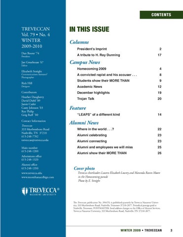 The Treveccan, publication No. 394470, is published quarterly by Trevecca Nazarene University, 333 Murfreesboro Road, Nashville, Tennessee 37210-2877. Periodical postage paid at Nashville, Tennessee. POSTMASTER: Send address changes to the Office of Alumni Services, Trevecca Nazarene University, 333 Murfreesboro Road, Nashville, TN 37210-2877.