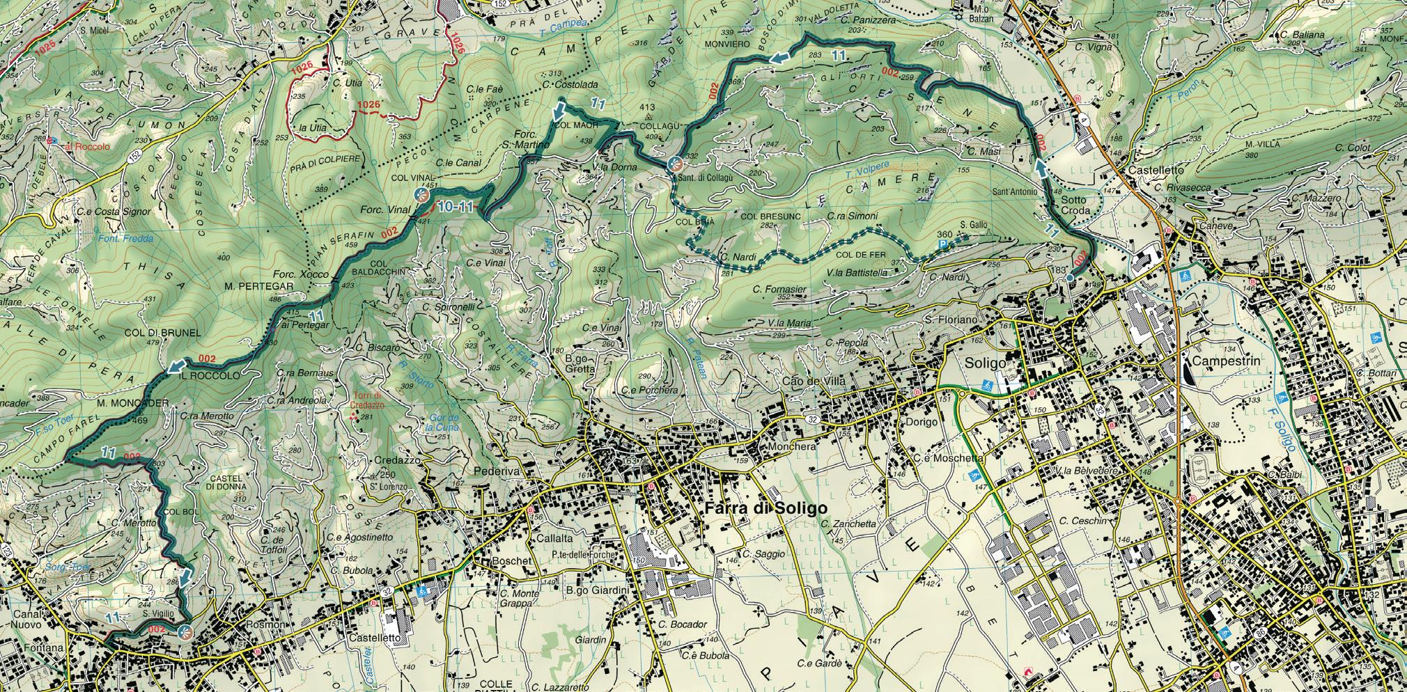 Iestende tra gli abitati di Soligo e di Col San Martino, a tutti gli effetti una catena montuosa in miniatura che rappresenta per l’escursionista una piccola avventura tra stradine, sentieri, salite e discese, in un contesto di notevole valore paesaggistico. La partenza è fissata alla chiesa parrocchiale dei Santi Pietro e Paolo a Soligo, posta ai piedi del Colle di San Gallo. La prima parte del percorso costeggia il fiume Soligo che si raggiunge percorrendo l’antica Strada delle Cavade. Dopo aver camminato lungo l’argine, incontriamo il capitello di Sant’Antonio dove ci teniamo a destra su via Croda seguendo un percorso molto frequentato dai runners che ci condurrà tra i vigneti in direzione del Bosco Impero. Tramite un sentiero che taglia il versante settentrionale di un colle, in breve raggiungeremo Collagù,