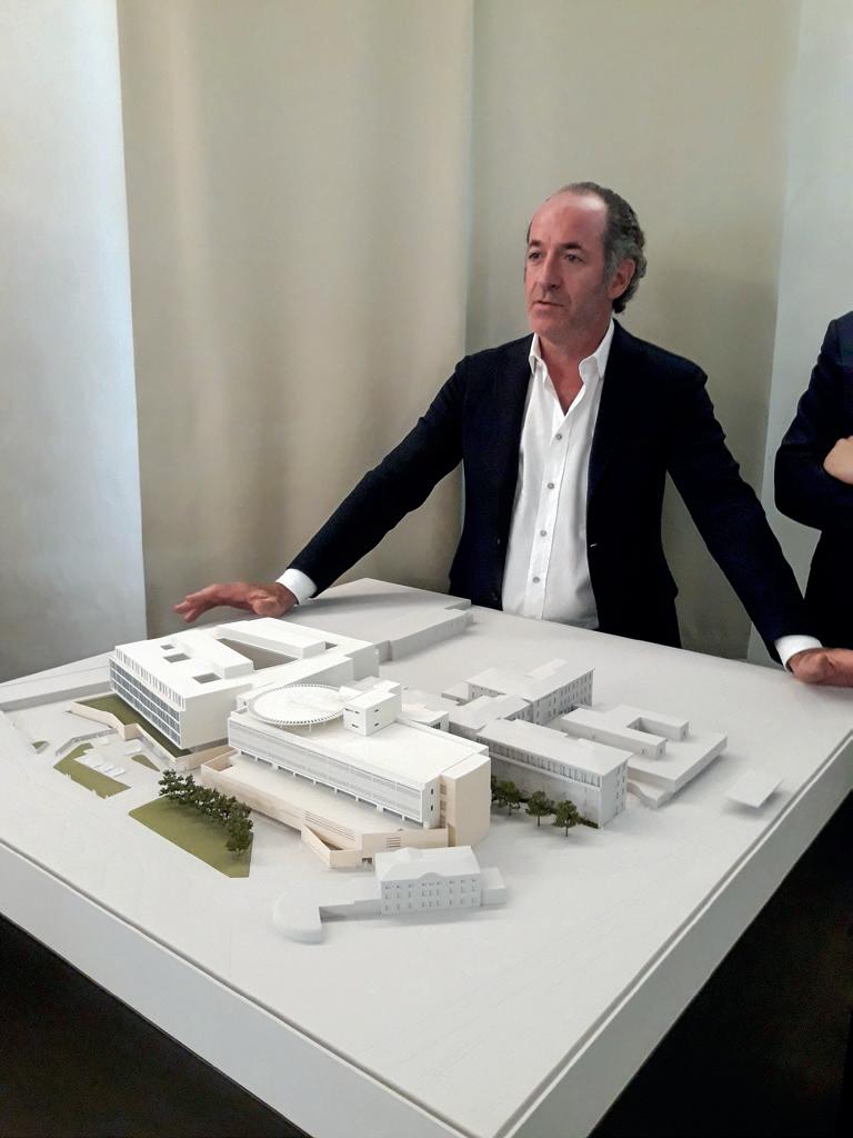 In alto a sinistra: Luca Zaia con il plastico del nuovo ospedale di Conegliano