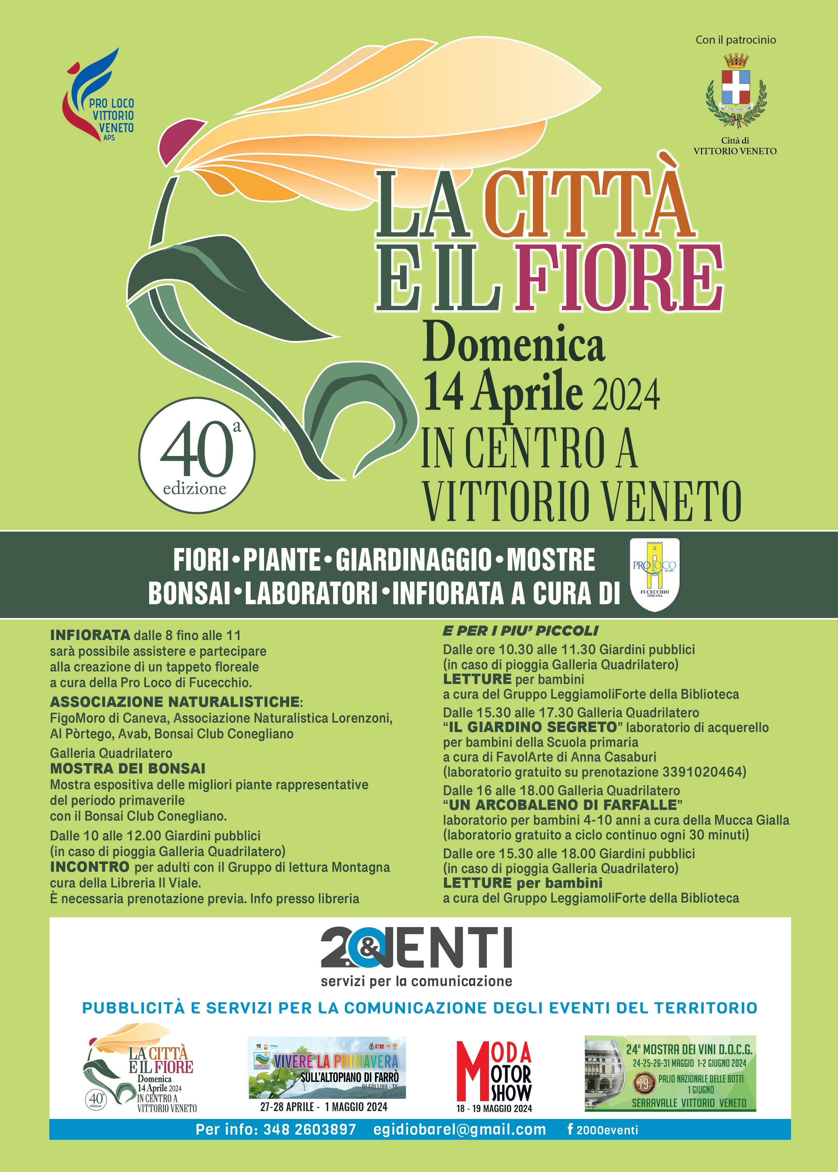 “La città e il fiore” giunge quest’anno alla sua 40esima edizione. L’appuntamento in piazza del Popolo e lungo il viale della Vittoria con la mostra-mercato di piante e fiori è per domenica 14 aprile dalle 8 alle 19. Una novità celebrerà l’importante anniversario: per la prima volta a Vittorio Veneto sarà realizzata, grazie alla collaborazione della Pro Loco di Fucecchio (Firenze), un’infiorata: utilizzando fiori e petali saranno realizzati suggestive creazioni artistiche.