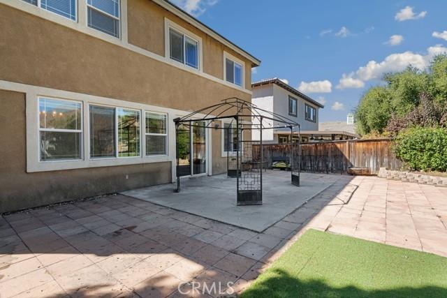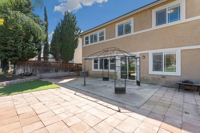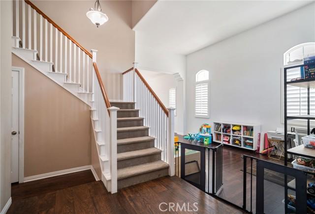 Exit to the backyard and enjoy the Alumawood patio cover with retractable shades and an outdoor fan, offering the perfect setup for year-round outdoor living.
