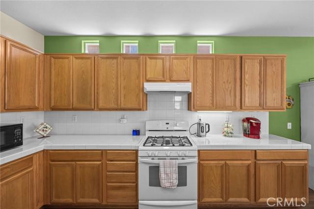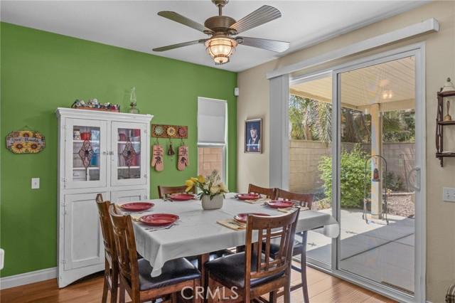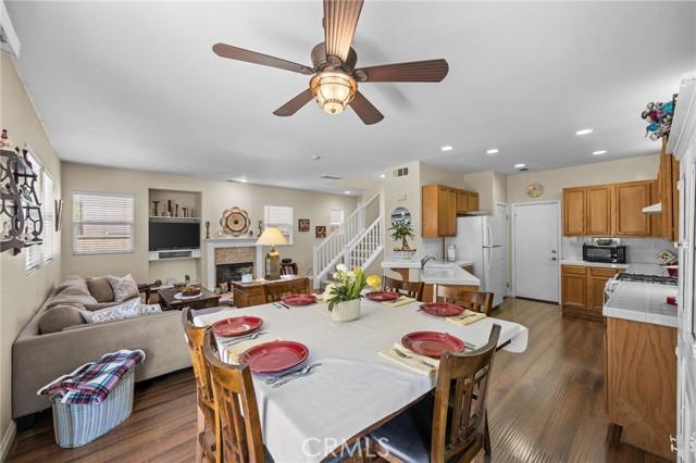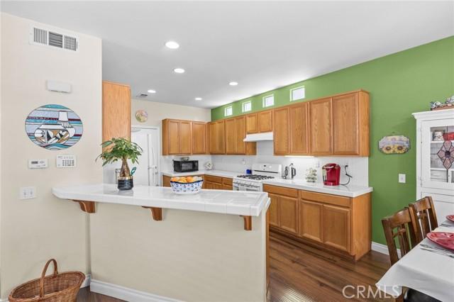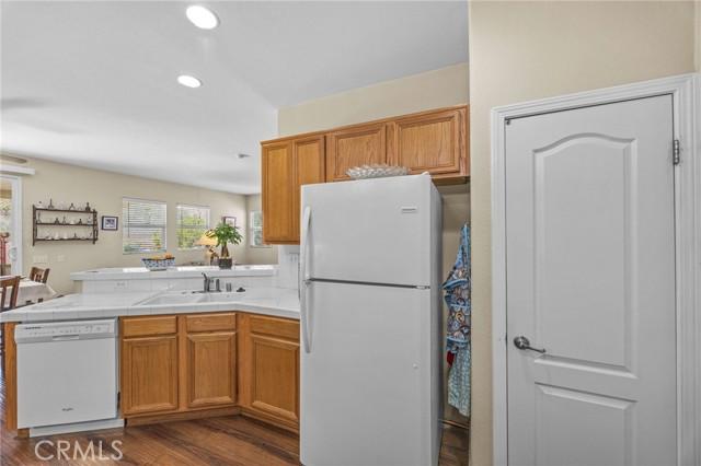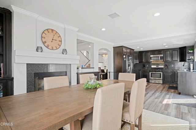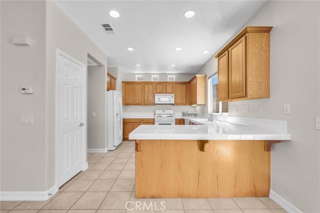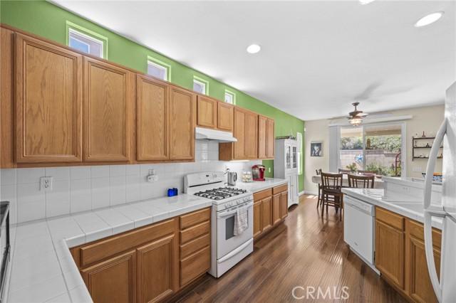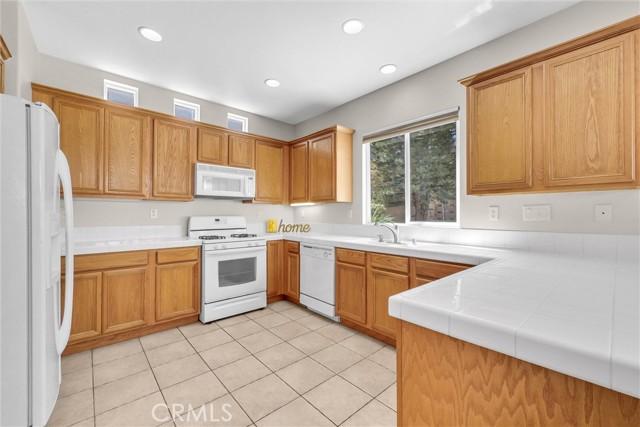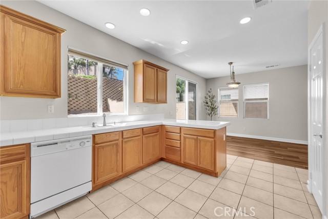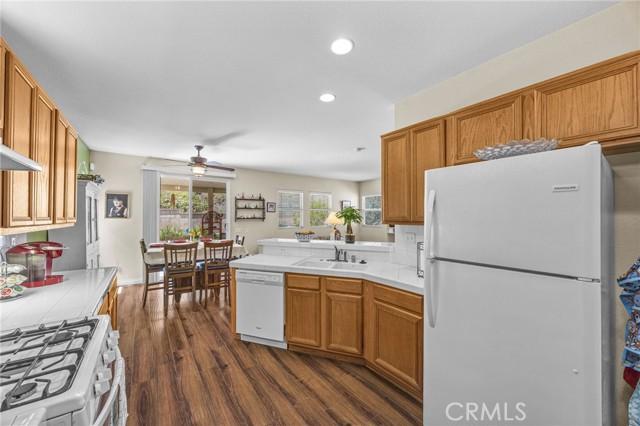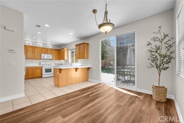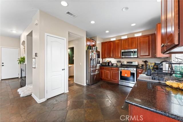 The spacious kitchen boasts rich wood cabinets, granite countertops, a walk-in pantry, and tile flooring, seamlessly opening to a bright dining areaideal for entertaining.