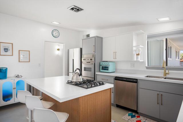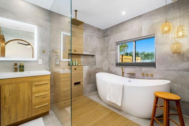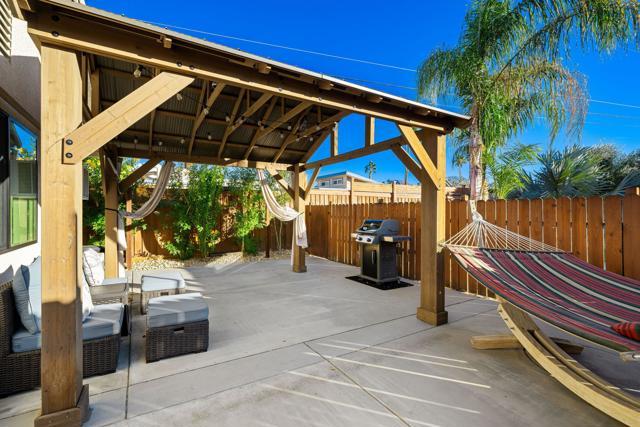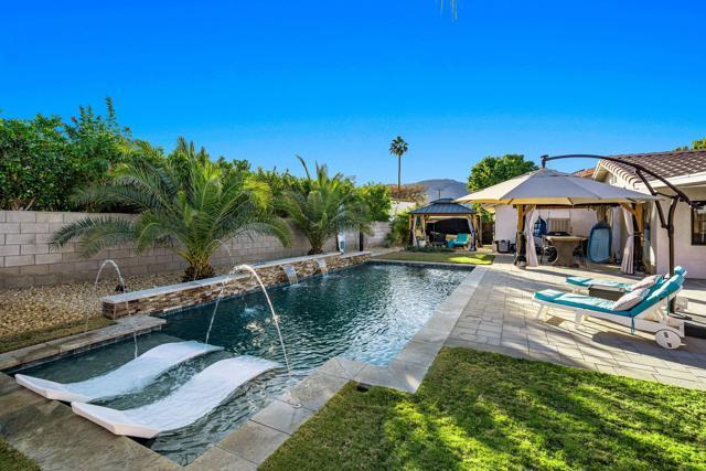 Stunning Fully Remodeled Mid-Century Contemporary Home in Palm Desert. This beautifully remodeled mid-century contemporary home is located in the heart of Palm Desert and offers both style and functionality. The impressive curb appeal features new cement walkways, artfully designed walls, and a classic breeze block, while the modern exterior includes a new garage door and thoughtfully landscaped grounds. Situated on a spacious 11,326 sq. ft. lot, the backyard has endless potential--perfect for building a pool, adding a Casita or ADU, and more. Inside, the open floor plan boasts stained concrete floors, a custom kitchen with new cabinetry, a stunning backsplash, and a large electric fireplace as the living room's centerpiece. The oversized slider opens to a large backyard, ideal for entertaining. The master bathroom features a designer dual-head shower system, while the guest bath showcases modern design. With new doors and windows throughout, this home perfectly combines luxury and contemporary living. Two outdoor patios--front and rear-are perfect for enjoying Palm Desert's weather, and the stylish gazebo in the backyard offers a peaceful retreat. This home is a must-see for anyone seeking a fully remodeled modern oasis.