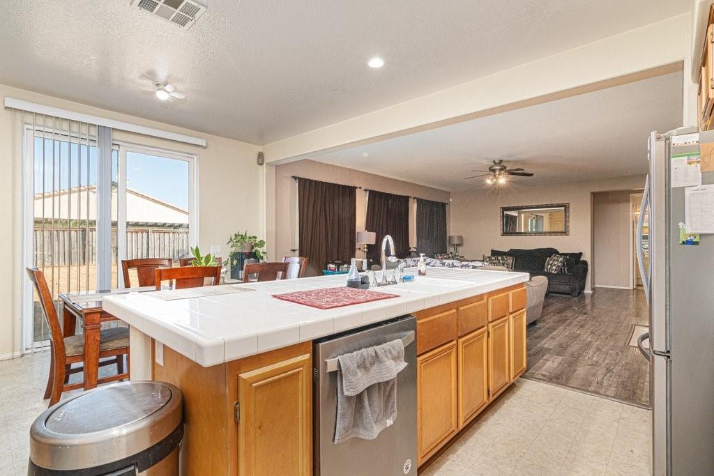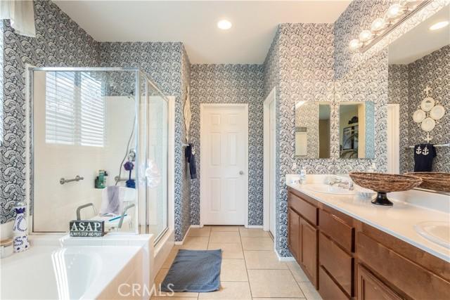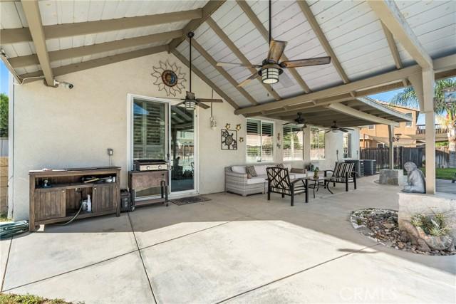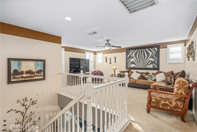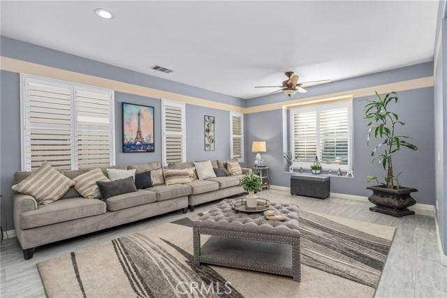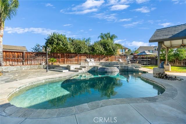 Welcome to this stunning home nestled on a generous lot in the highly desirable northwest San Jacinto area. Boasting 3,127 square feet of elegantly designed living space, this residence offers a blend of comfort and luxury. The thoughtful floor plan features 4 spacious bedrooms and 4 full bathrooms, including a convenient bedroom and full bath on the ground floor. As you enter, you'll be greeted by a formal living room and dining area, perfect for hosting gatherings. The expansive family room is ideal for relaxing, while the chefs kitchen is a true highlight, complete with a central island, ample counter and cupboard space, a butler's pantry, and a built-in desk for workspace. Upstairs, you'll find three additional bedrooms, a versatile loft area, and 3 full baths. The master suite is a retreat unto itself, featuring a generously sized bedroom and a luxurious master bath with a garden tub and separate shower. The home is adorned with quality details, including plush carpeting, elegant tile flooring, and plantation shutters throughout. The backyard is a private oasis with a sparkling pool and spa, patio and bar area, mature landscaping, fruit trees, and RV parking.
