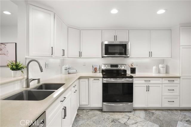 Experience an abundance of natural light with new oversized dual-pane windows and sliding glass doors throughout. The soaring vaulted ceilings and new recessed lighting throughout enhance the beautifully updated kitchen, elegant dining area, and cozy family room with waterfront views. Culinary enthusiasts will adore the modern kitchen, complete with new designer quartz countertops, sleek skinny white shaker cabinets, and a custom floating shelf. New stainless steel appliances and garbage disposal make this space perfect for both everyday meals and entertaining guests.