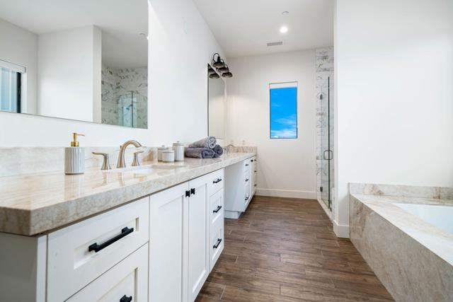 Welcome Investors or Families that need a spacious home with a bit of separation. This stunning completely remodeled property has been designed into 2 separate units. This property features a 4 bedroom and 3.5 bath contemporary property in the Thousand Palms area. Spacious master with fully renovated modern restrooms with tiled flooring. Beautiful modern designed kitchen. Tons of outdoor living/entertaining spaces in the backyard with a high-covered patio and, a fully built-in kitchen set-up. two-car garage in the rear of the property, with a long driveway, which is great for storage or extra vehicles. No HOA and you own the land.