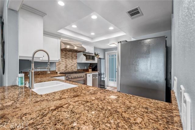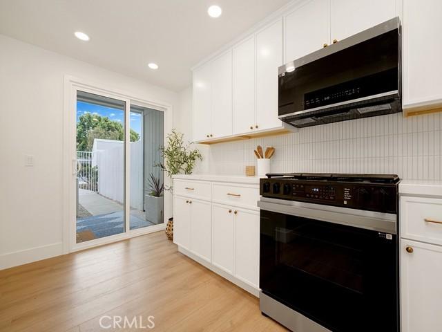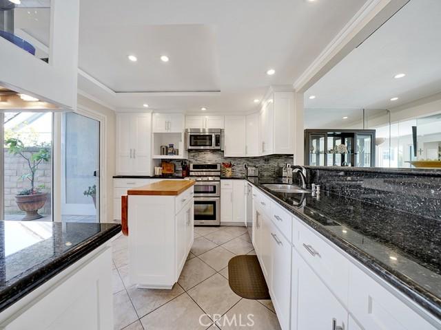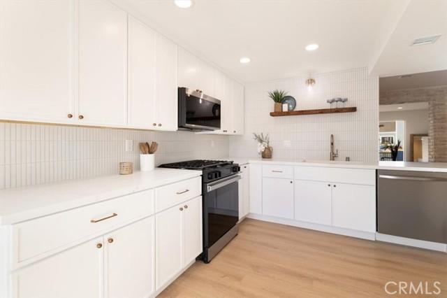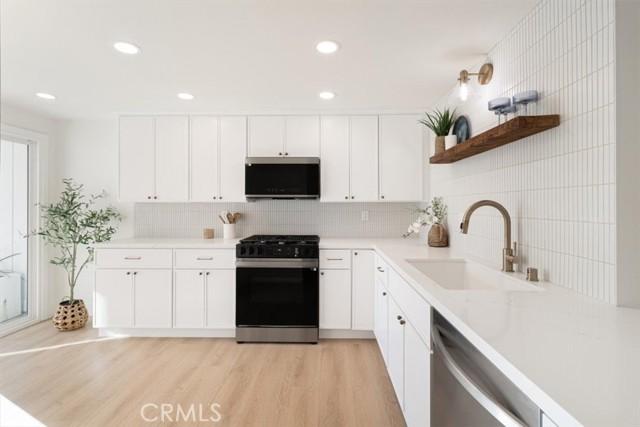 Experience an abundance of natural light with new oversized dual-pane windows and sliding glass doors throughout. The soaring vaulted ceilings and new recessed lighting throughout enhance the beautifully updated kitchen, elegant dining area, and cozy family room with waterfront views. Culinary enthusiasts will adore the modern kitchen, complete with new designer quartz countertops, sleek skinny white shaker cabinets, and a custom floating shelf. New stainless steel appliances and garbage disposal make this space perfect for both everyday meals and entertaining guests.