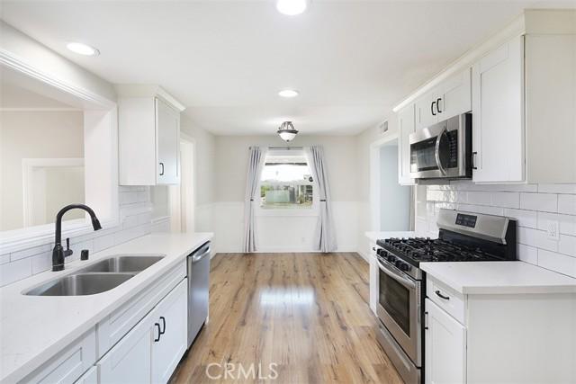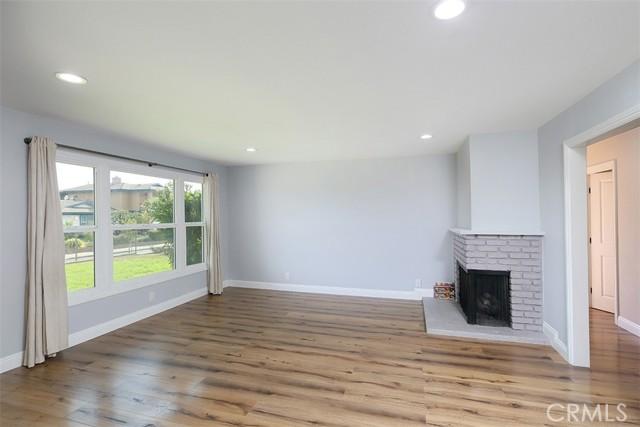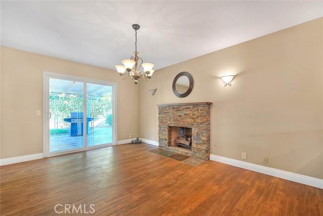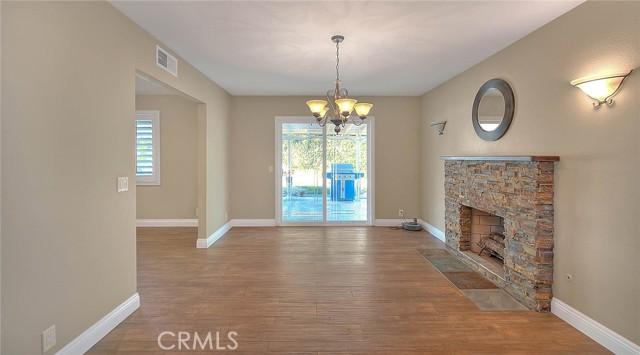 fireplace and large picture window. The open-concept kitchen features quartz countertops, stainless steel appliances, and a generous dining area. A step-down family room includes a freestanding potbelly fireplace and sliding doors that open to the backyard and patio. The home has three bedrooms, one of which includes French doors leading to a private outdoor space, along with two updated bathrooms. Additional highlights include a two-car garage with direct access, laminate flooring throughout, recessed lighting, and an indoor laundry area.