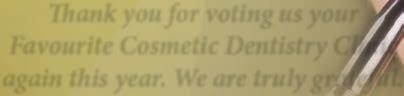 Thank youfor voting us your Favourite CosmeticDentistry Clinic againthis year.Weare trulyg rateful.