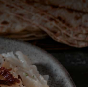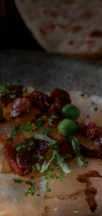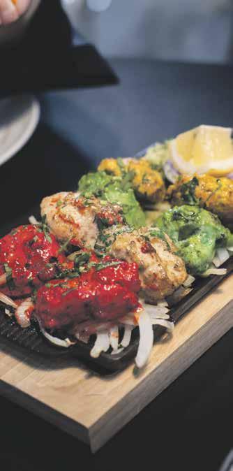 med kyllingrett, linser, grønnsak, ris, salat, nan, raita og dessert.
