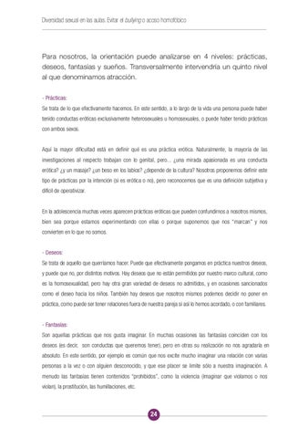 Para nosotros, la orientación puede analizarse en 4 niveles: prácticas, deseos, fantasías y sueños. Transversalmente intervendría un quinto nivel al que denominamos atracción. - Prácticas: Se trata de lo que efectivamente hacemos. En este sentido, a lo largo de la vida una persona puede haber tenido conductas eróticas exclusivamente heterosexuales u homosexuales, o puede haber tenido prácticas con ambos sexos. Aquí la mayor dificultad está en definir qué es una práctica erótica. Naturalmente, la mayoría de las investigaciones al respecto trabajan con lo genital, pero... ¿una mirada apasionada es una conducta erótica? ¿y un masaje? ¿un beso en los labios? ¿depende de la cultura? Nosotros proponemos definir este tipo de prácticas por la intención (si es erótica o no), pero reconocemos que es una definición subjetiva y difícil de operativizar. En la adolescencia muchas veces aparecen prácticas eróticas que pueden confundirnos a nosotros mismos, bien sea porque estamos experimentando con ellas o porque suponemos que nos “marcan” y nos convierten en lo que no somos. - Deseos: Se trata de aquello que querríamos hacer. Puede que efectivamente pongamos en práctica nuestros deseos, y puede que no, por distintos motivos. Hay deseos que no están permitidos por nuestro marco cultural, como es la homosexualidad, pero hay otra gran variedad de deseos no admitidos, y en ocasiones sancionados como el deseo hacia los niños. También hay deseos que nosotros mismos podemos decidir no poner en práctica, como puede ser tener relaciones fuera de nuestra pareja si así lo hemos acordado, o con familiares. - Fantasías: Son aquellas prácticas que nos gusta imaginar. En muchas ocasiones las fantasías coinciden con los deseos (es decir, son conductas que queremos tener), pero en otras su realización no nos agradaría en absoluto. En este sentido, por ejemplo es común que nos excite mucho imaginar una relación con varias personas a la vez o con alguien desconocido, y que ese placer se limite sólo a nuestra imaginación. A menudo las fantasías tienen contenidos “prohibidos”, como la violencia (imaginar que violamos o nos violan), la prostitución, las humillaciones, etc.