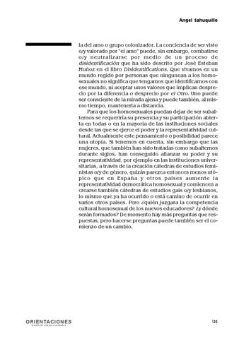 la del amo o grupo colonizador. La conciencia de ser visto o/y valorado por “el amo” puede, sin embargo, combatirse o/y neutralizarse por medio de un proceso de disidentificación que ha sido descrito por José Esteban Muñoz en el libro Disidentifications. Que vivamos en un mundo regido por personas que ningunean a los homosexuales no significa que tengamos que identificarnos con ese mundo, ni aceptar unos valores que implican desprecio por la diferencia o desprecio por el Otro. Uno puede ser consciente de la mirada ajena y puede también, al mismo tiempo, mantenerla a distancia. Para que los homosexuales puedan dejar de ser subalternos se requeriría su presencia y su participación abierta en todas o en la mayoría de las instituciones sociales desde las que se ejerce el poder y la representatividad cultural. Actualmente este pensamiento o posibilidad parece una utopía. Si tenemos en cuenta, sin embargo que las mujeres, que también han sido tratadas como subalternos durante siglos, han conseguido afianzar su poder y su representatividad, por ejemplo en las instituciones universitarias, a través de la creación cátedras de estudios feministas o/y de género, quizás parezca entonces menos utópico que en España y otros países aumente la representatividad democrática homosexual y comiencen a crearse también cátedras de estudios gais o/y lesbianos, lo mismo que ya ha ocurrido o está camino de ocurrir en varios otros países. Pero ¿quién juzgara la competencia cultural homosexual de los nuevos educadores? ¿y dónde serán formados? De momento hay más preguntas que respuestas, pero hacerse preguntas puede también ser el comienzo de un cambio.