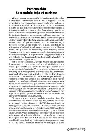 Presentación Exterminio bajo el nazismo Vivimos en una nueva eclosión de escritos y estudios sobre el exterminio masivo que llevó a cabo el régimen nazi. Es como si algo que ocurrió hace unos sesenta años todavía no hubiera sido entendido. Y, efectivamente, no lo ha sido, hasta el punto de que algunos han hecho de lo incomprensible la única manera de acercarse a ello. Sin embargo, por todas partes surgen estudios historiográficos, nuevos testimonios de testigos directos, narraciones y películas que giran en torno a los campos de la muerte. Hace pocos años que el escritor húngaro Imre Kertész ha empezado a ser conocido y traducido (también premiado) en todo el mundo. Los testigos directos, como Jorge Semprún, siguen aportando su testimonio, añadiéndose a los que empezaron a publicarse desde 1947 (por parte de Primo Levi y Robert Antelme). Roman Polanski acaba de hacer una reacreación cinematográfica de un relato escrito por un superviviente del gueto de Varsovia, una película que ha recorrido medio mundo y también ha sido variadamente premiada. Por el lado de la filosofía, Giorgio Agamben ha publicado dos entregas de lo que compondrá una trilogía titulada Homo sacer , que aporta un renovado enfoque acerca de la comprensión de Auschwitz. Y hay una heterogénea corriente historiográfica que se plantea el estudio de la Segunda Guerra mundial desde el punto de vista de sus víctimas. Pero dejemos bien anotado que mucho de este esfuerzo por entender y reentender qué fue aquello del exterminio está menos motivado por un ímpetu historicista (a veces incluso por parte de los estudios históricos) que por una meditación sobre el presente más estricto. En este punto son muy explícitos tanto Kertész (suyos son los ensayos titulados “La vigencia de los campos” o “El holocausto como cultura”) como Agamben. Hay algo de urgente, perentoriamente actual en todo ese movimiento que no es una revisión. Si no nos movemos del ámbito español, también encontramos iniciativas de todo tipo. Reyes Mate, que dirige un seminario sobre el tema en el CSIC, ha coordinado un monográfico colectivo titulado “La filosofía después del holocausto”, publicado en la revista Isegoría (2000) y editado posteriormente como libro en Ríopiedras (2002). En el ámbito catalán, que hay que destacar que es pionero en este terreno, se ha recuperado el inestimable testimonio en forma de novela de Joaquim Amat-Piniella, K. L. Reich (en catalán y castellano), restableciéndose los fragmentos que el franquismo censuró en su momento. Destacan también los trabajos de David 4