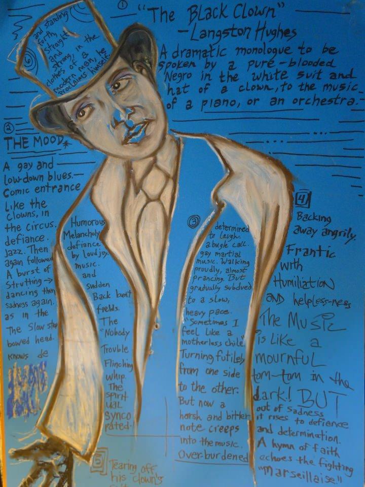 In the new work from Anthony Thompson Adeagbo and Renaldo Davidson, entitled Langston Hughes: The Black Clown Performance Art Exhibition, an arrangement of Hughes’ dramatic monologue, The Black Clown, is performed by Adeagbo in collaboration with Renaldo Davidson’s exhibition of visual pieces inspired by Hughes’ monologue, the life of Bert Williams, and Abbey