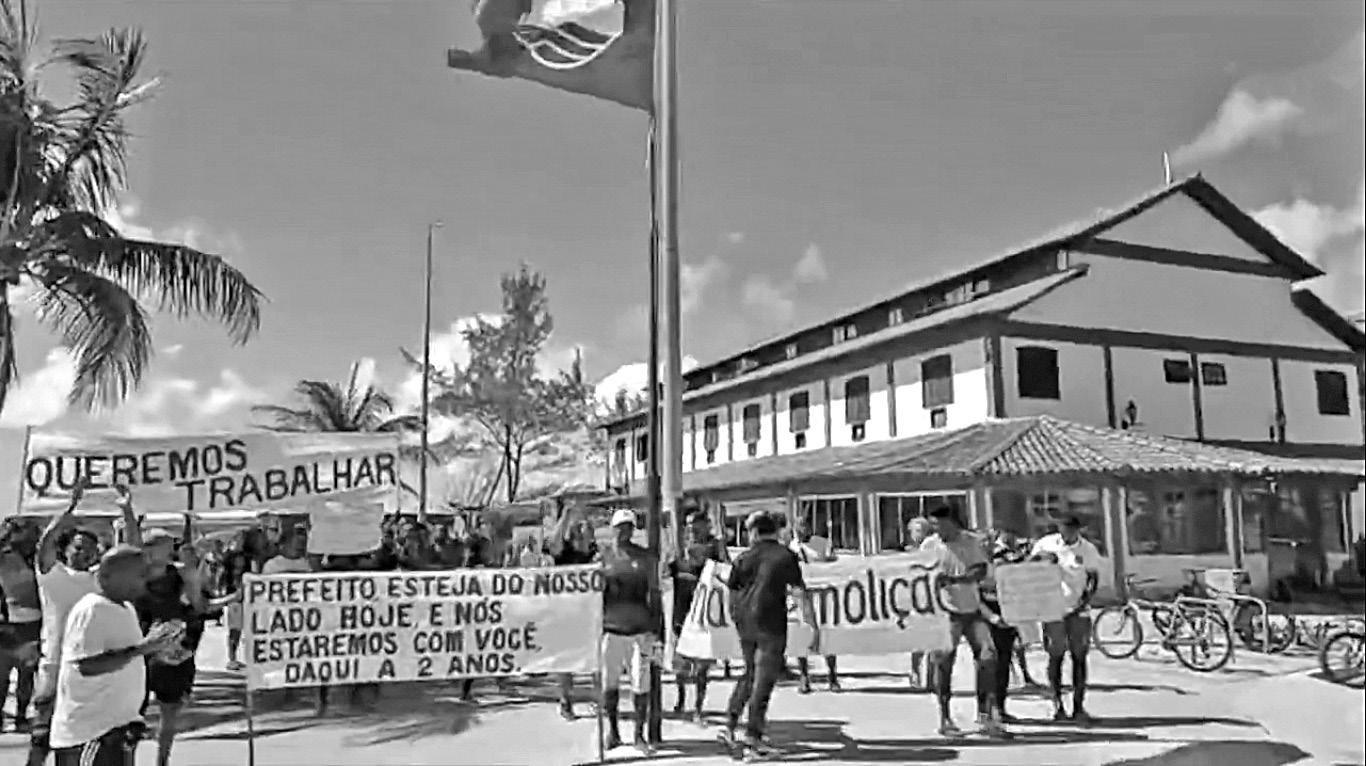 Trabalhadores dos quios ques da Praia das Conchas, em Cabo Frio, na Região dos Lagos do Rio, fazem uma manifestação na ma nhã de quinta-feira (17) con tra a ordem de desocupação e demolição dos imóveis que ficam na orla da praia.