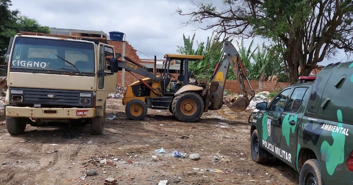 Agentes da 8ª Unidade de Policiamento Ambiental flagraram, na manhã de quarta-feira (16), um caminhão e uma retroescavadeira des cartando resíduos de construção civil de forma irregular, em