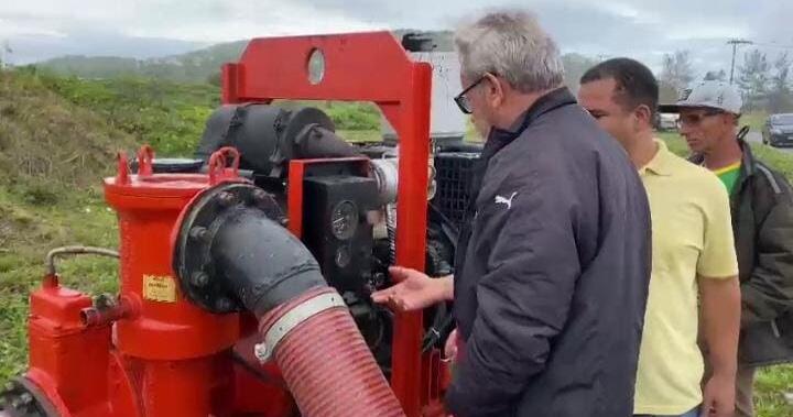 Na segunda-feira (28), a Secretaria de Obras reali zou a instalação da primeira bomba com vazão de 5 mi lhões de litros/h em Tucuns para escoar as áreas alaga das dos bairros de São José e Capão. Toda a operação está sendo acompanhada pelo secretário de Obras e vice-prefeito Miguel Perei ra e pelo prefeito Alexandre Martins.