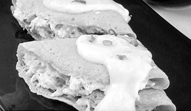 Transfira para um prato e repita o procedimento até o término da massa. Espalhe o recheio no centro da massa e feche em duas, formando um leque. Transfira para um refratário. Depois, bata no liquidificador o leite, a maisena, o iogurte, o queijo, sal e pimenta a gosto e leve ao fogo baixo mexendo sempre até en grossar. Despeje sobre a panqueca e asse em forno alto, prea quecido, por 15 minutos. Polvilhe a cebolinha e sirva em seguida.