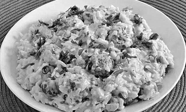 Em uma tigela, misture a carne, o ovo e o cre me de cebola. Modele bolinhas do tamanho desejado, passe pela farinha, frite em óleo quente e escorra em papel-toalha. Em segui da, reserve. Agora em uma panela, derreta a manteiga em fogo médio e refogue a cebola com o alho por 3 minutos. Adicione o tomate, o arroz e refogue por 3 minutos. Depois, junte a maionese, a água e refogue por 2 minutos Junte o creme de leite, as almôndegas, tem pere com sal, pimenta e cheiro-verde e sirva em seguida.