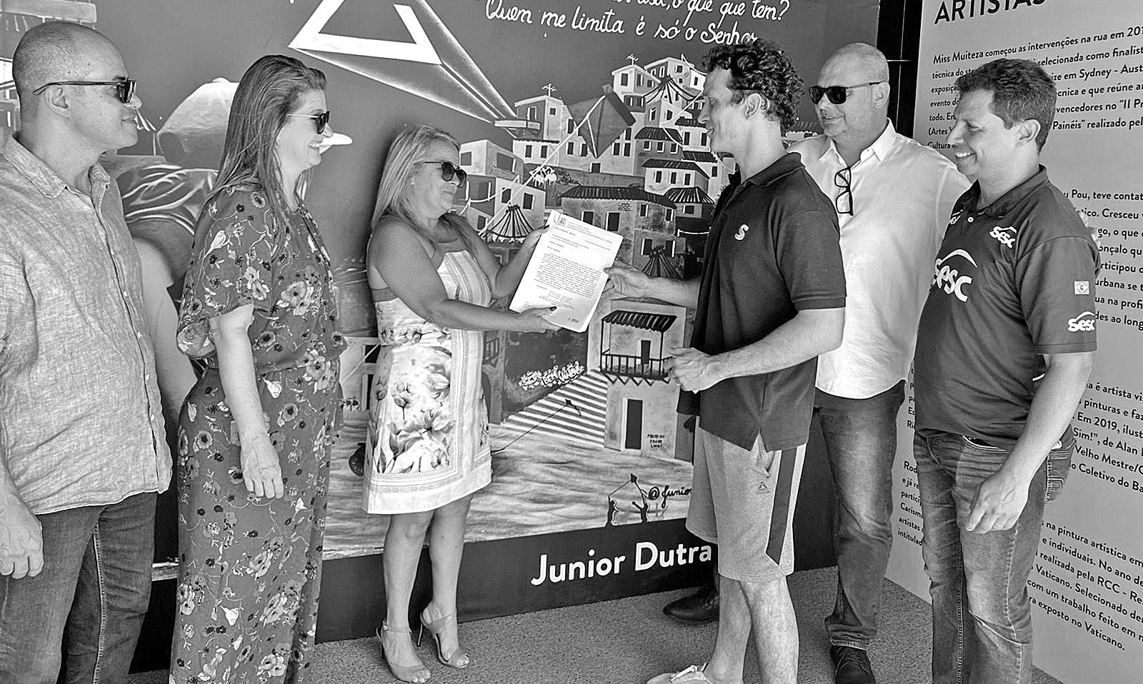 Econômico e Turismo, Lara Velho, que entregaram a solicitação ao gerente de relacionamento com clientes e empresa do Sesc-RJ, Pedro Paulo de Toledo Gagemi.