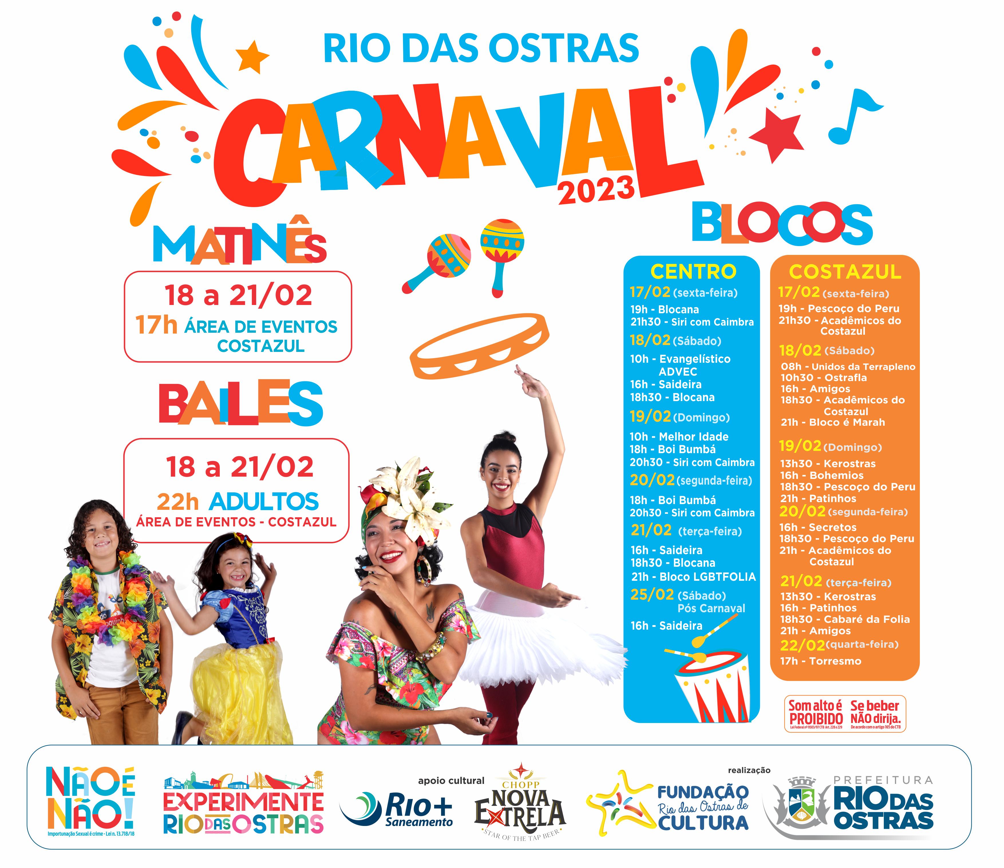 Visando a segurança e o bem-estar dos alunos e profissionais da Rede Pública Municipal de Ensino de Rio das Ostras no período de Carnaval, a Secretaria Municipal de Educação editou a Resolução 05/2023, que dispõe sobre o horário de funcionamento das Unidades Escolares entre os dias 17 e 24 de fevereiro de 2023. Na sexta-feira (17), as aulas do turno da tarde serão encerradas às 16 horas e as unidades, fechadas às 17 horas. O turno da noite foi suspenso e a aula será reposta com plano de estudos. Já na quinta-feira (23) e sexta-feira (24) não haverá aulas e as unidades escolares estarão fechadas. Retornarão na segunda-feira (27).