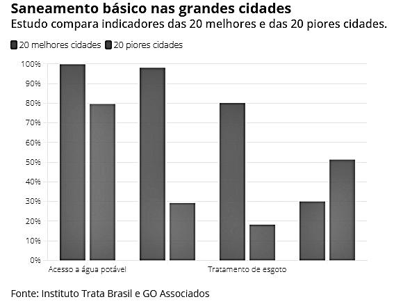 De um lado, cidades em que quase todos os moradores têm acesso a água potável e coleta de esgoto, além de baixo desperdício e altos níveis de investimento em obras de saneamento. Do outro, municípios em que metade da água tratada é perdida por conta de tubulações antigas e “gatos” e em que apenas três a cada dez moradores têm acesso a coleta de esgoto. Essa desigualdade sanitária e social é um dos destaques de um estudo do Instituto Trata Brasil com a GO Associados, divulgado nesta segunda-feira (20). Pág. 5