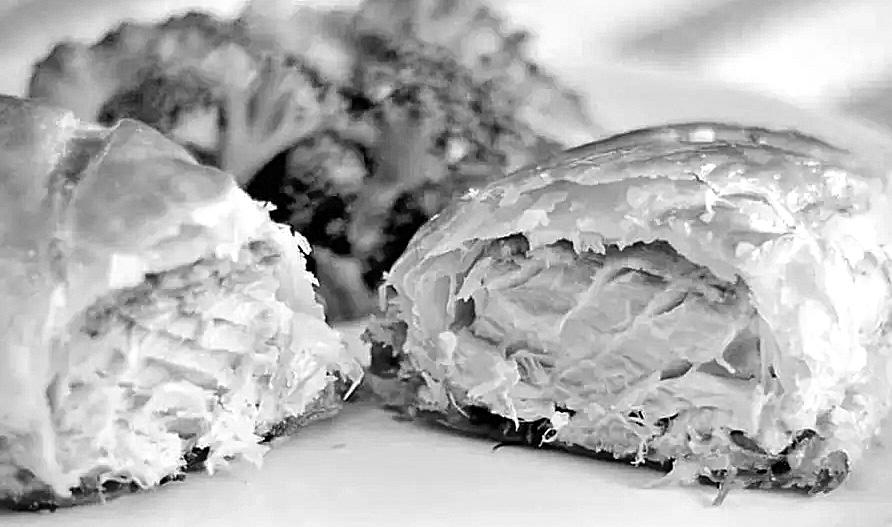 Em seguida, polvilhe com farinha de rosca, coloque cada filé de salmão em um pedaço de massa folhada e tempere com sal e pimenta.
