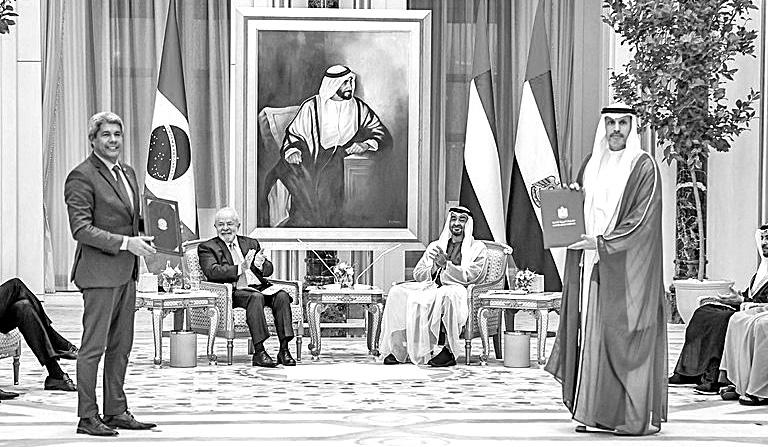 4. Ambos os líderes concordaram em aprofundar ainda mais a parceria estratégica entre os EAU e o Brasil em áreas chave, incluindo energia renovável, ciência e tecnologia, desenvolvimento sustentável, educação, ação climática, multilateralismo, defesa, aviação, espaço, segurança alimentar e agricultura, transporte, logística e cooperação. As duas partes discutiram a crescente agenda econômica bilateral e exploraram vias para expandir o comércio e investimentos. Também se empenharam em aprofundar o intercâmbio de análises sobre questões regionais e internacionais.